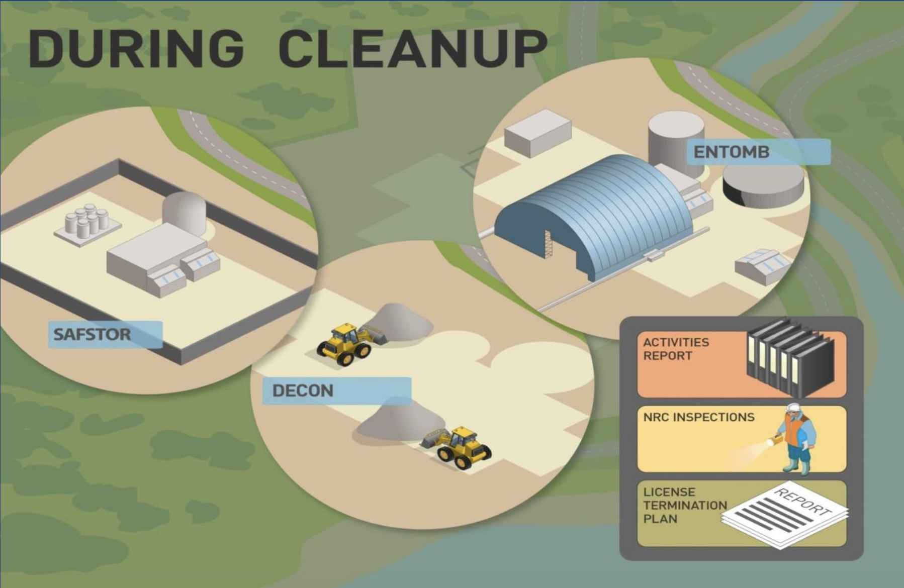 The NRC permits decommissioning nuclear power plants in 3 ways: DECON, ENTOMB and SAFSTOR (see image)